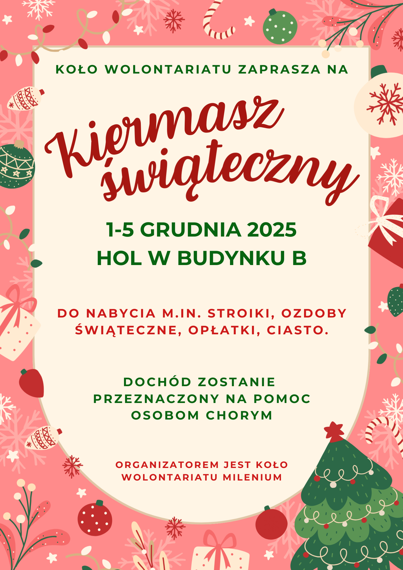 Wolontariat Milenium serdecznie zaprasza na Charytatywny Kiermasz Świąteczny. Przez cały przyszły tydzień, od 1 grudnia do 5 grudnia, w holu w budynku B będzie można nabyć m.in. pyszne ciasto, ozdoby, stroiki, opłatki i wiele innych. Zebrane środki ze sprzedaży zostaną przekazane na cele charytatywne.