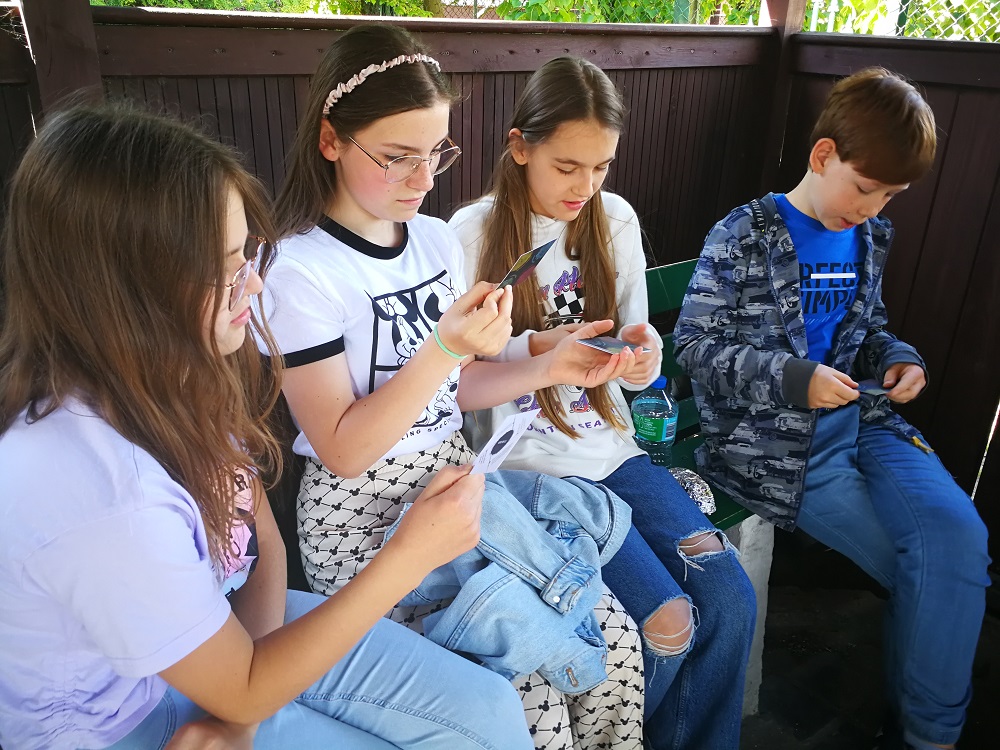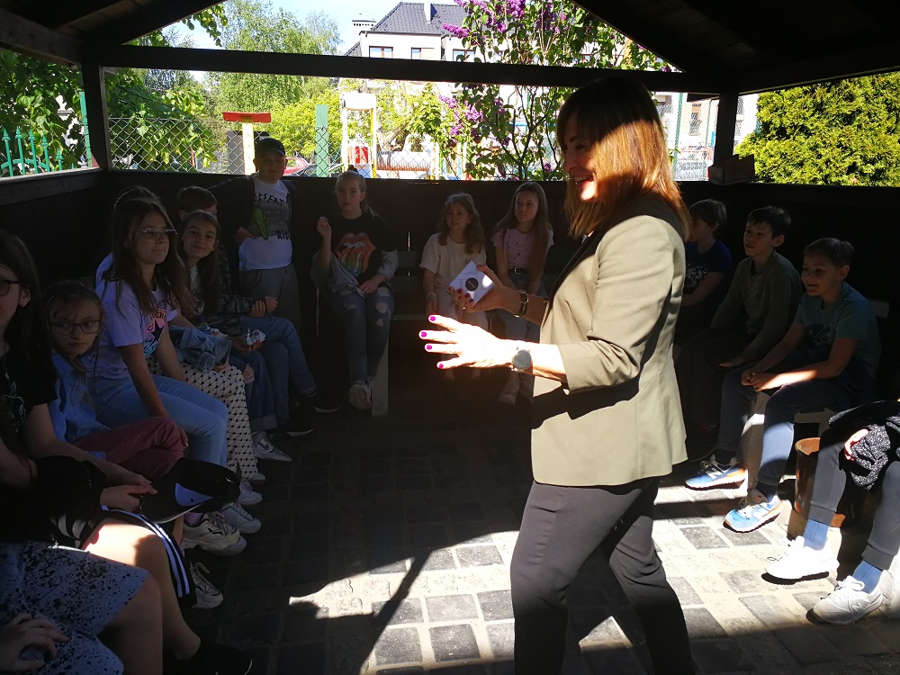 Uczniowie klasy 5 skorzystali dziś z pięknej słonecznej pogody i pod okiem Pani pedagog Zofii Kowalskiej rozmawiali o roli uczuć w życiu człowieka poza murami swojej klasy.