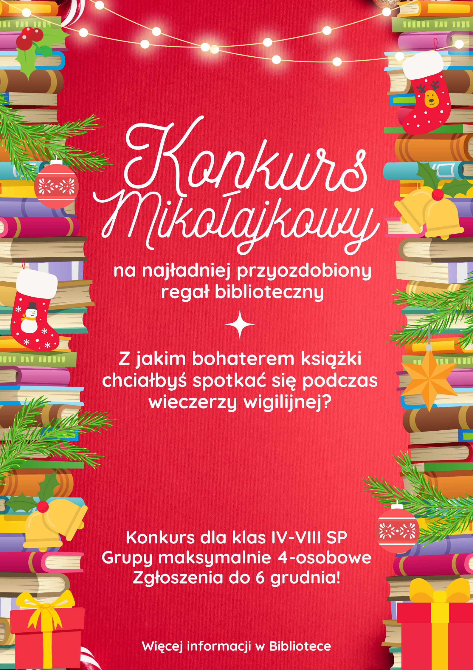 Biblioteka Szkoły Podstawowej Milenium zaprasza do udziału w Konkursie Mikołajkowym na najładniej przyozdobiony regał biblioteczny! Z jakim bohaterem książki chciałbyś spotkać się podczas wieczerzy wigilijnej?