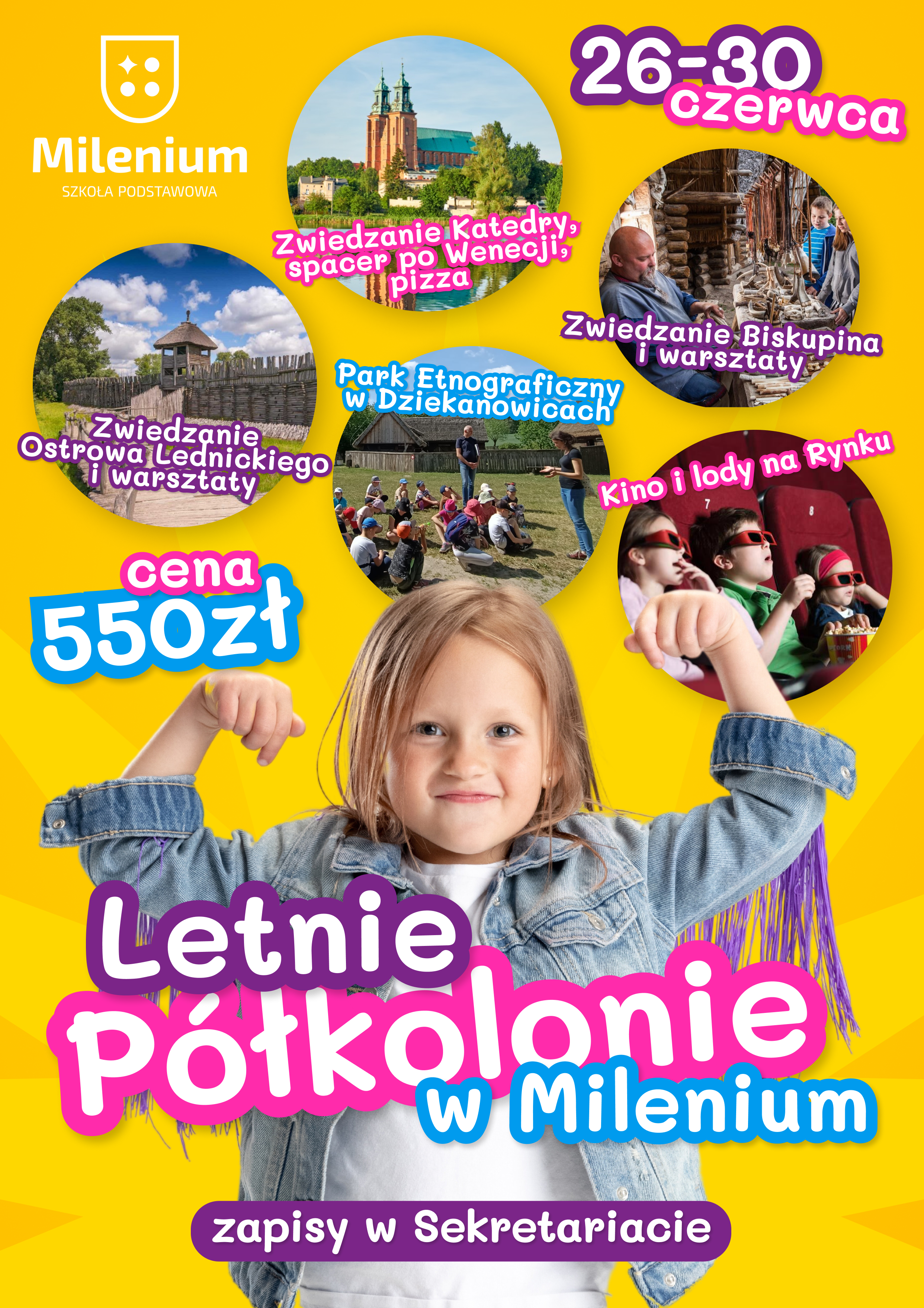 Jak co roku, Szkoła Podstawowa Milenium zaprasza dzieci na Letnie Półkolonie. Czeka nas pełen przygód letni tydzień, który połączy edukację z dobrą zabawą. Półkolonie będą trwały od poniedziałku do piątku w terminie 26-30 czerwca 2023 roku. Cena to 550 zł. Rodzice chętni zapisać swoje dzieci na półkolonie mogą zgłaszać się do Sekretariatu (z odliczoną gotówką). Liczba miejsc ograniczona!