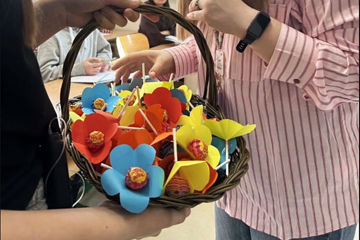 Z okazji Dnia Kobiet w naszej szkole zrobiło się dziś wyjątkowo kolorowo i słodko. Uczniowie z Samorządu Uczniowskiego przygotowali własnoręcznie papierowe kwiatki, którymi ozdobili lizaki rozdawane wszystkim Paniom — uczennicom, nauczycielkom oraz pracownicom szkoły.