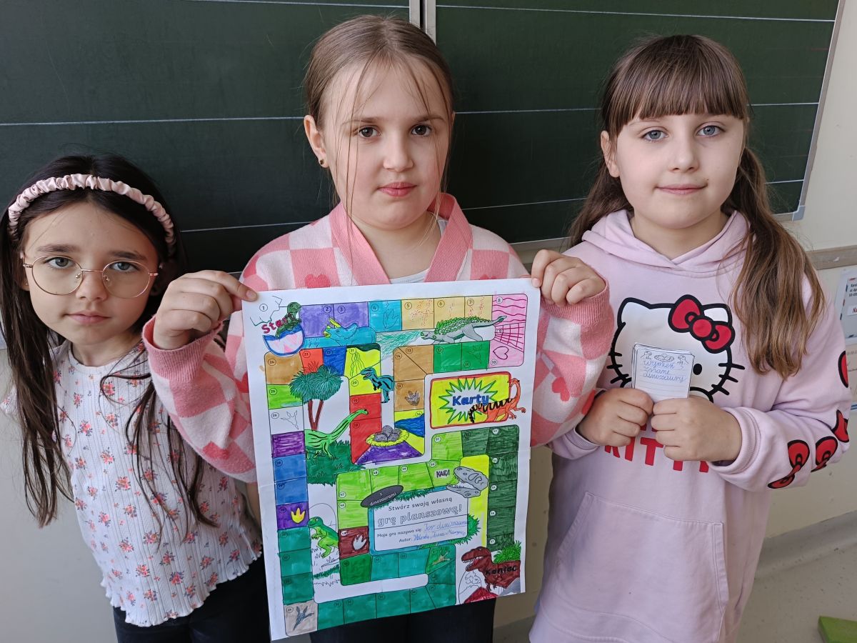 Dinozaury ciekawią i fascynują dzieci od najmłodszych lat, a uczniowie klasy 2a mieli okazję zgłębić ten temat na zajęciach w szkole. Jedną z podjętych aktywności było tworzenie gier planszowych, które w fascynujący sposób łączyły edukację z rozrywką. Dzieci musiały wykazać się nie tylko wyobraźnią i kreatywnością, ale również zakresem wiedzy ogólnej przy tworzeniu pytań i zadań do gry.