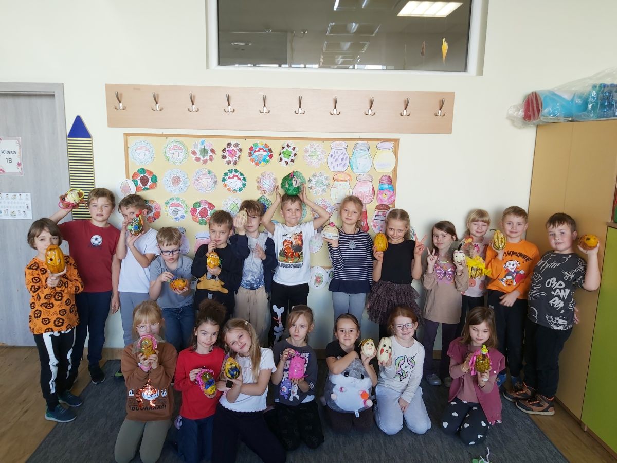 Klasa 1B obchodziła wspaniały Dzień Dyni! Uczniowie z wielkim zaangażowaniem tworzyli ludki z ozdobnych dyń, wykazując się ogromną kreatywnością i wyobraźnią. Mali artyści z zapałem malowali gipsowe szkatułki w kształcie dyni, które zamieniły się w kolorowe jesienne ozdoby.
