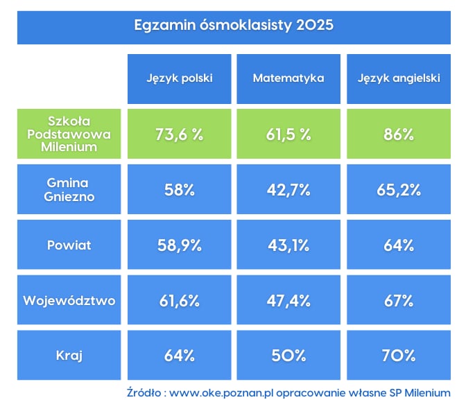 Dziś poznaliśmy wyniki egzaminów ósmoklasisty 2025. Nasi uczniowie kolejny rok z rzędu zdobyli imponujące wyniki. Gratulujemy ósmoklasiści! Jesteśmy pewni, że z takimi świadectwami ostaniecie się do wymarzonych szkół średnich.